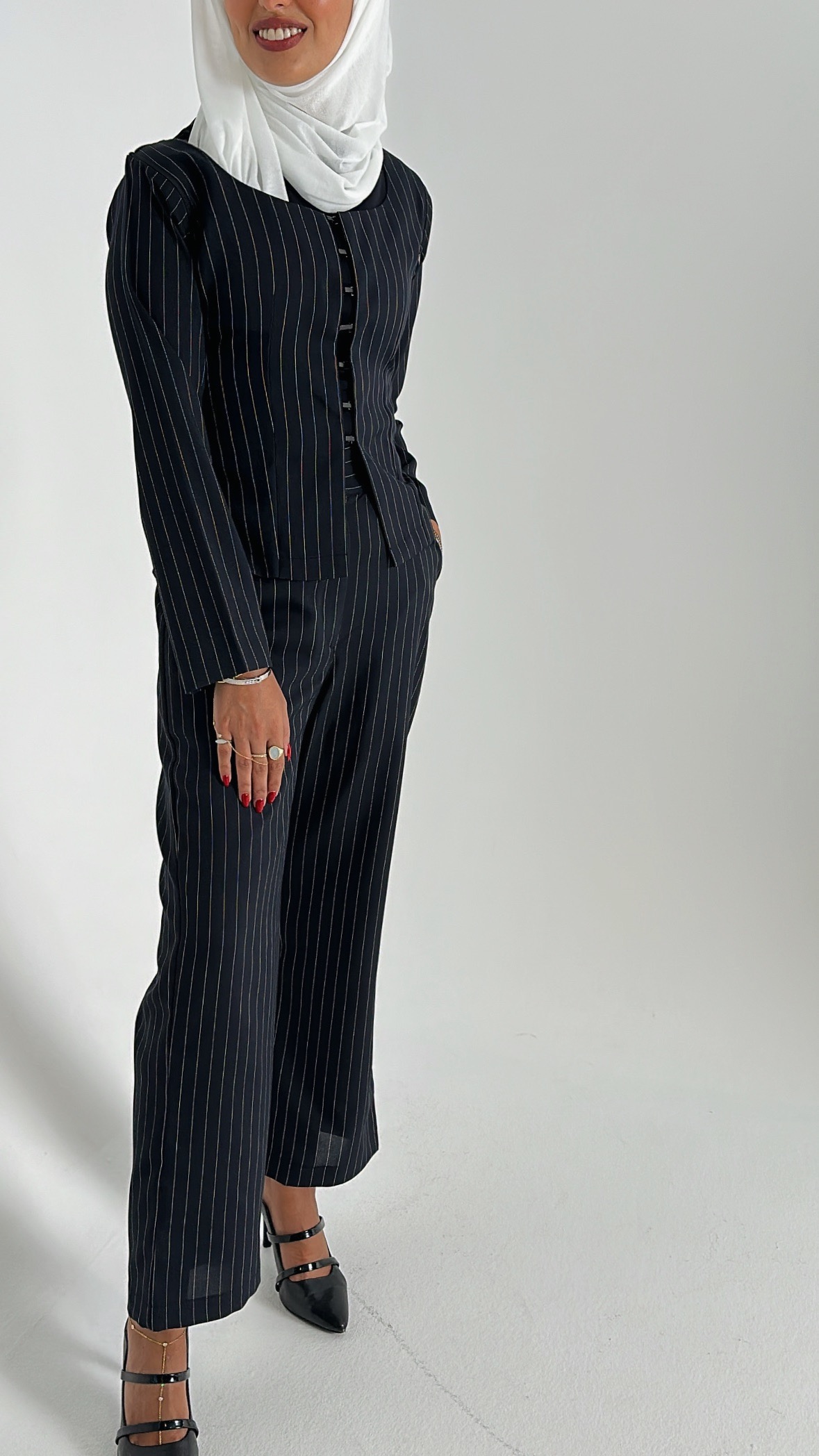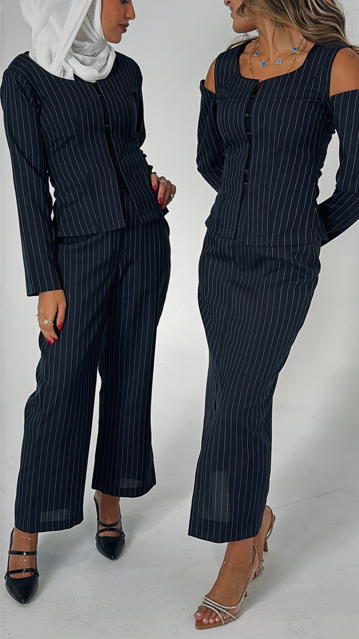 Two-piece set: skirt or pants with a top. Features an adjustable shoulder zipper. All items are custom-made and non-refundable or non-exchangeable.