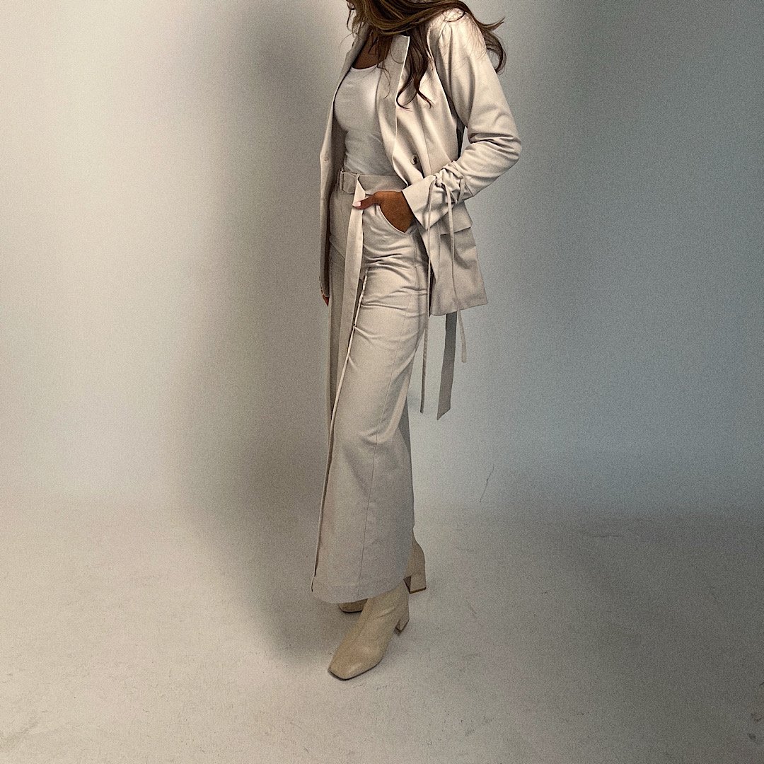Stylish two-piece outfit made from stretch denim fabric. The blazer features front pockets, brown buttons, and a back tie belt that can be adjusted for a fitted look. The matching pants come with a waist belt for extra style and comfort. Perfect for a chic and modern appearance (no refund no exchange)
