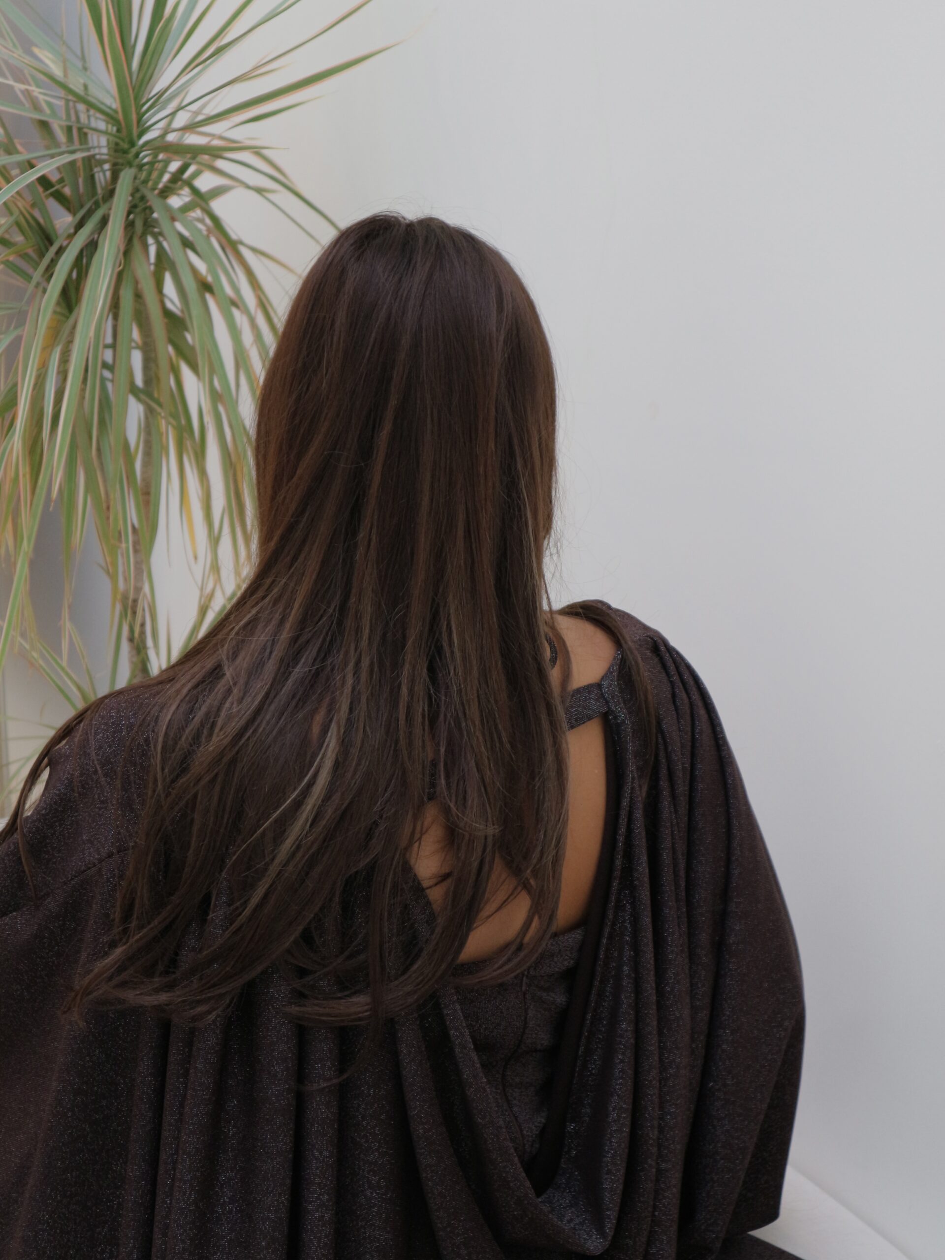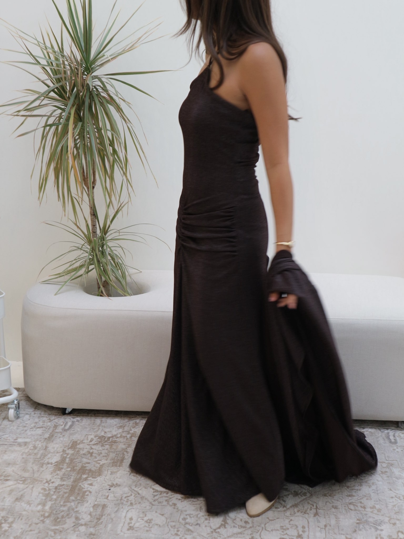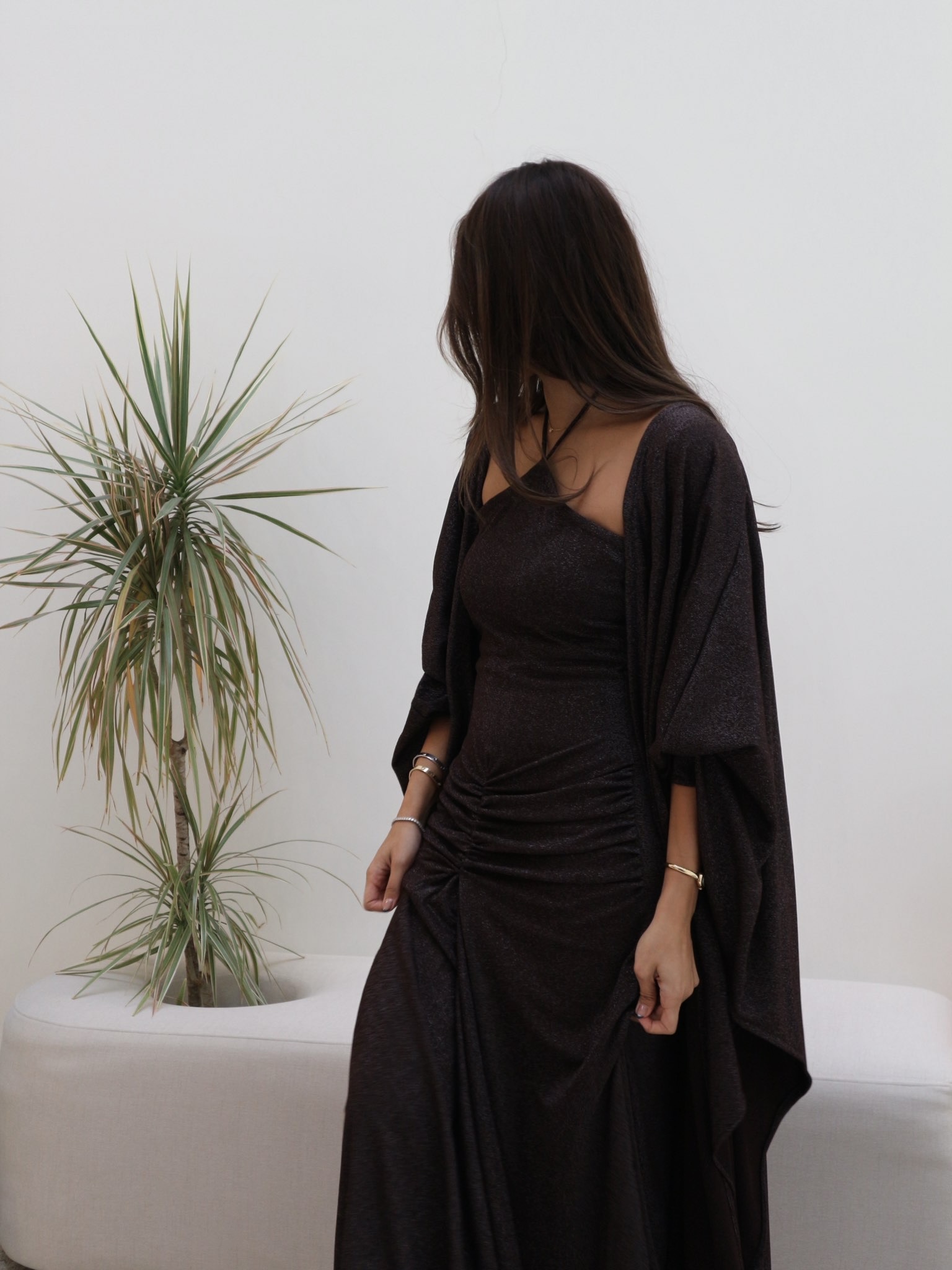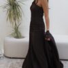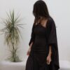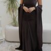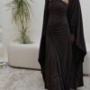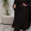 The dress is designed with a flattering gathered front, while the bisht has a unique back cut that adds a modern touch to the look.