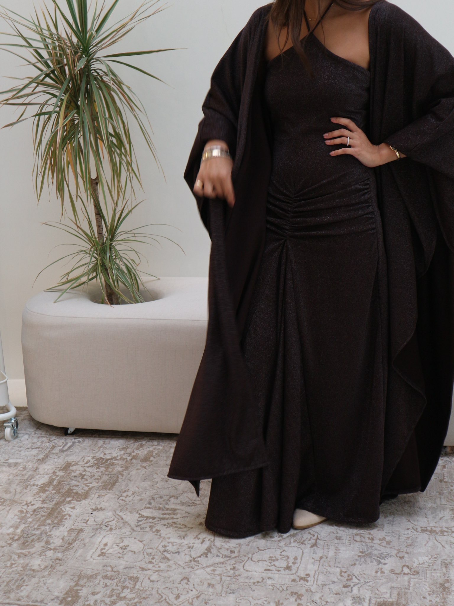 A chic two-piece set featuring a shimmer fabric daraa paired with a matching bisht.